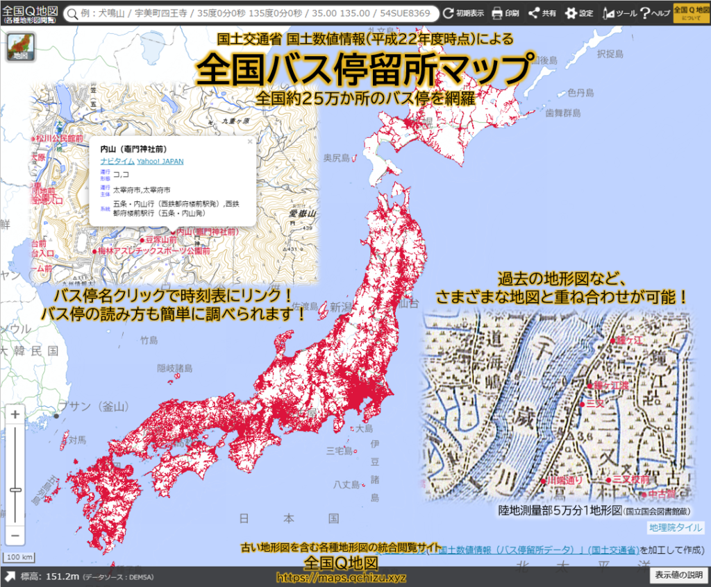この地図は、国土数値情報として国土交通省が公開している平成22年度時点の全国のバス停留所25万か所の情報を地図上にプロットしたものです。