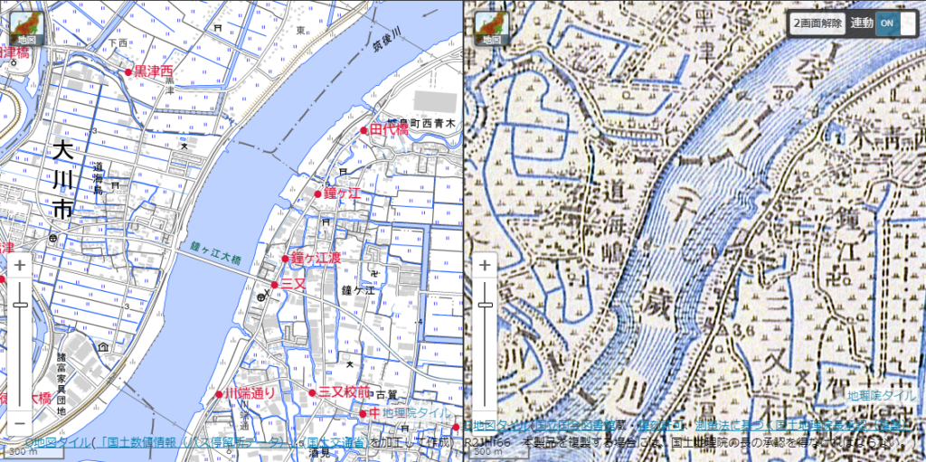 気になる名前のバス停を見つけたら、古い地形図や自治体が作成した大縮尺図など、全国Q地図の他のコンテンツと重ね合わせてバス停の名前の由来を探ることができます。