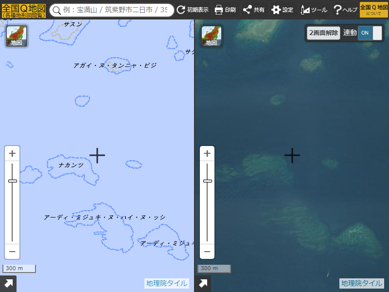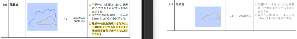 平成14年図式まで存在した、水面下の珊瑚礁を示す青い隠顕岩の記号が復活しました。今回の図式変更で一番の変更点と思います。